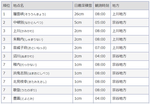 道内各地でも現在(12月2日時点)では積雪量は0cmがほとんどですが、上川地方や宗谷地方の一部では積雪量が観測されています。(資料:気象庁HPより)
