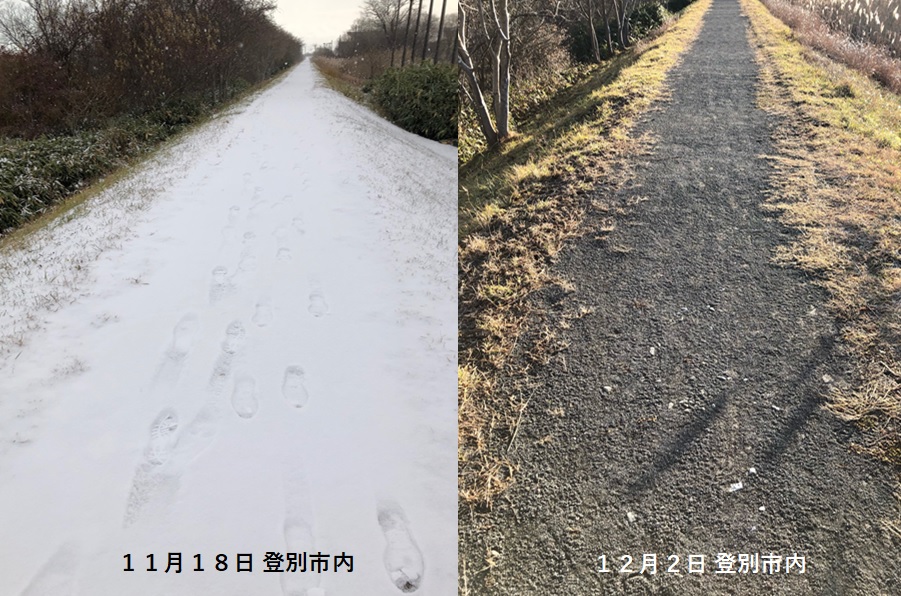 北海道では11月に各地で積雪が観測され、登別市でも11月18日には路面が白くなるくらいの雪が積もりました。